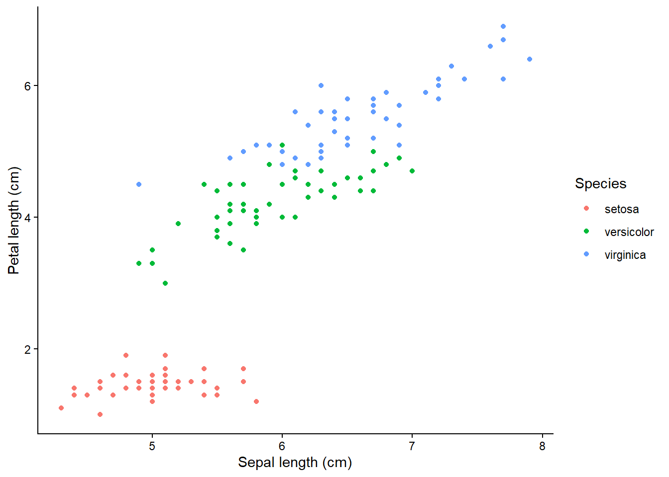 + labs(y = "Petal length (cm)", x = "Sepal length (cm)", colour = "Species")